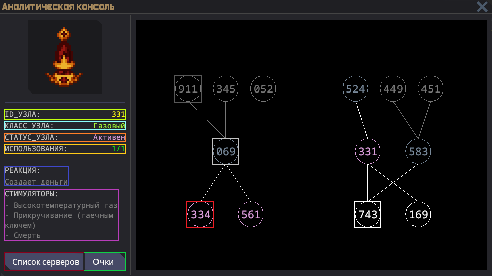 Консоль, на которой видны все узлы, их реакции и стимуляторы. Необходимо подключение к Анализатору артефактов.